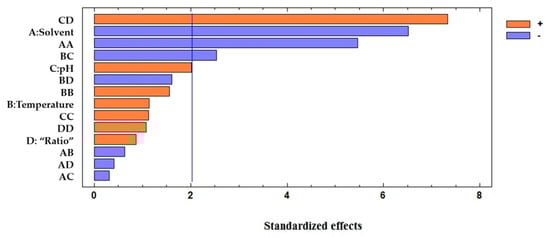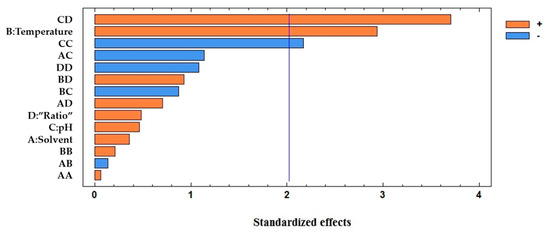 The obtained standardized Pareto chart representing the optimization of the total anthocyanins extraction.