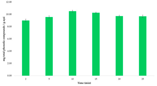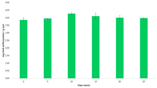 To assess the kinetics of the extraction process, three different extractions were carried out under the optimum conditions using different extraction times (2, 5, 10, 15, 20, and 25 min). It can be observed from Figure 3 that the optimum time for the extraction, i.e., when the maximum recovery of anthocyanins is obtained, was 10 min. In fact, longer extraction periods affect the anthocyanins recovery, likely due to the degradation of these compounds because of the temperature [60].