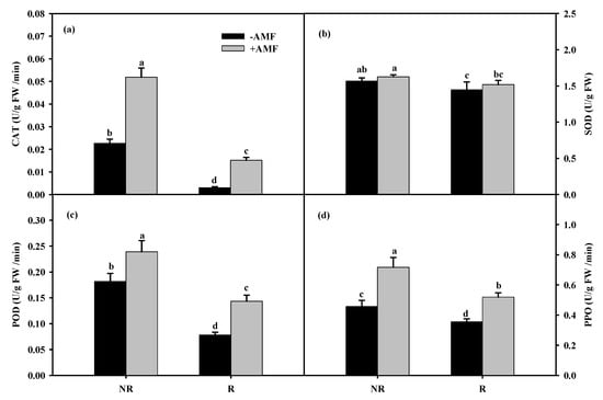 Soil R treatment produced a significant increase in root CAT, POD, and PPO activity but a decrease in root SOD activity, as compared with soil NR treatment, irrespective of whether it was AMF inoculated (Figure 2). AMF inoculation increased root CAT, POD, and PPO activity in NR and R soils, relative to non-AMF treatment (Figure 2a,c,d). Compared to non-AMF seedlings, mycorrhizal seedlings showed higher root CAT, POD, and PPO activities: 129%, 32%, and 57% higher under NR soil and 403%, 84%, and 46% higher under R soil. Mycorrhizal treatment did not alter root SOD activity under NR and R soils (Figure 2b).