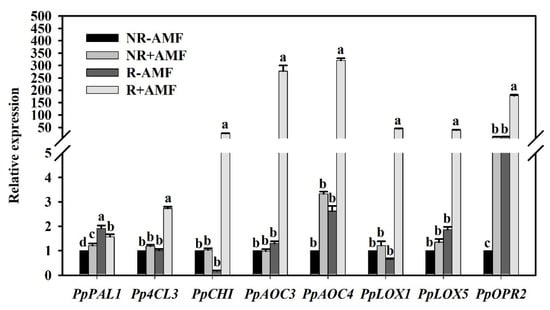 AMF inoculation up-regulated the root Pp4CL3 gene expression level under NR and R treatment conditions, respectively, compared with that observed upon non-AMF inoculation (Figure 3). The relative expression of PpPAL1 in roots was increased upon mycorrhizal inoculation under NR soil, while it was reduced under R soil with AMF treatment. Compared with the non-AMF treatment, AMF inoculation increased root PpCHI gene expression levels as much as 142 times under R control. Compared with the non-mycorrhizal treatment, AMF inoculation up-regulated the expression levels of root PpOPR2 gene under NR condition. Nevertheless, under R soil condition, the expression levels of root PpAOC3, PpAOC4, PpLOX1, PpLOX5, and PpOPR2 genes were increased by AMF inoculation.