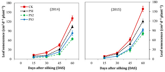 Effects of paclobutrazol treatments on the leaf senescence rate in maize during 2014 and 2015. Data are presented as mean ± SD of three measurements. CK, PS1, PS2, and PS3 represent seed treatment with paclobutrazol at the rate of 0, 200, 300, and 400 mg L−1, respectively.