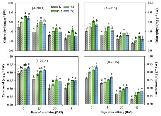 Paclobutrazol treatments, sampling times, and year showed significant effects on total chlorophyll contents. In addition, the interaction among the various factors was non-significant, except for P × T (Table 3). With the progression of days after silking, chlorophyll contents gradually declined in all treatments. However, the degradation of photosynthetic pigments was markedly inhibited in paclobutrazol treatments compared to control treatment (Figure 3A). The PS2-treated plants maintained higher chlorophyll contents throughout the growing season during both years (2014–2015). However, the chlorophyll content in PS3 treatment was inhibited than that in PS2 treatment and was similar to that in PS1 treatment at various sampling stages. The two years’ mean results portrayed that the chlorophyll content of PS1, PS2, and PS3 treatments were increased by 22.4%, 48.2%, and 36.9% at 0 DAS, 32.1%, 54.3%, and 38.2% at 15 DAS, 26.3%, 51.2%, and 27.8% at 30 DAS, 30.2%, 79.0%, 32.2% at 45 DAS, compared to control treatment, respectively (Figure 3A).