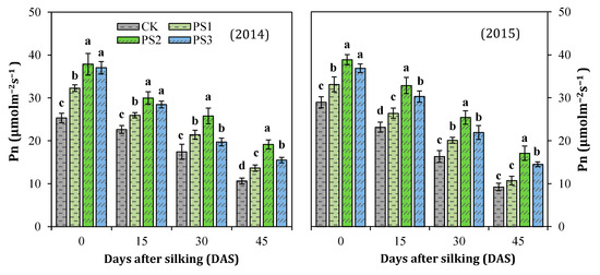 The net photosynthesis rate was significantly affected by paclobutrazol treatments and sampling times. The interactions of paclobutrazol and sampling times (P × T), and year and sampling times (Y × T) was also significant (Table 3). The net photosynthesis rate showed a gradual decline with the increase in days after silking in all treatments (Figure 4). Paclobutrazol application at high concentrations (PS2 and PS3) significantly enhanced the net photosynthesis rate from 0 to 30 DAS, compared to control. However, the highest concentration of paclobutrazol (PS3) inhibited the net photosynthesis rate at the later growth stages (30 and 45 DAS) relative to PS2 treatment, associated with an increased leaf senescence rate. As depicted in Figure 4, among all the treatments, PS2 maintained significantly higher net photosynthetic rate at 0 DAS (greater by 49.5% and 34.2%), 15 DAS (32.5% and 41.9%), 30 DAS (47.9% and 55.3%), and 45 DAS (80.0% and 84.6%), compared to control from 2014 to 2015, respectively.