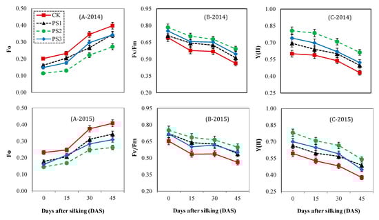 Paclobutrazol treatments, sampling times, and year exhibited significant effects on primary fluorescence (Fo) (Table 3). The value of Fo gradually increased with an increase in the days after silking. However, the paclobutrazol-treated plants exhibited a decline in the Fo values compared to control plants. The two years’ (2014 and 2015) mean results showed that the Fo values of PS1, PS2, and PS3 treatments were decreased significantly by 21.5%, 40.6%, and 28.8% at 0 DAS, 14.2%, 38.1%, and 18.3% at 15 DAS, 20.0%, 34.8%, and 19.2% at 30 DAS, 15.9%, 35.9%, and 24.2% at 45 DAS, respectively (Figure 5A).