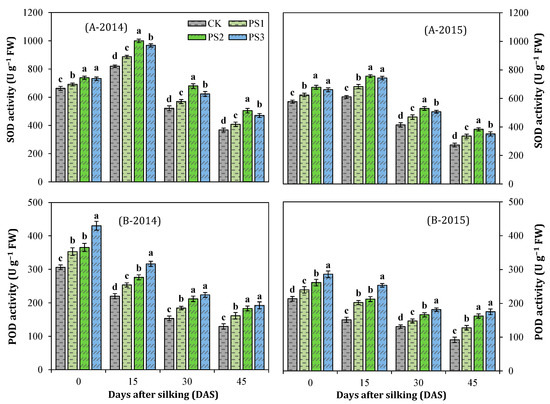 Similarly, the paclobutrazol treatments, year and sampling times exhibited significant effects on POD activity. Among the various interactions, only Y × P was not significant (Table 3). The enzyme activity was greater (31.9%) in 2014 than in 2015. In both years, the POD activity was maximal at 0 DAS and then considerably declined in all treatments with the progression of days after silking (Figure 6B). With an increase in the paclobutrazol treatment concentrations, POD activity was positively improved at all growth stages from 2014 to 2015. During the leaf senescence process, PS3 treatment exhibited the highest POD activity compared to other paclobutrazol treatments and the control (Figure 6B). The two years’ mean (2014 and 2015) results portrayed that PS1, PS2, and PS3 treatment significantly increased the POD activity by 13.9%, 21.0%, and 37.3% at 0 DAS, 24.5%, 33.0%, and 55.7% at 15 DAS, 16.3%, 32.2%, and 41.9% at 30 DAS, 31.8%, 59.2%, and 69.5% at 45 DAS, compared with control, respectively.