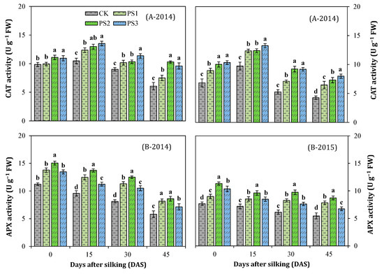 The paclobutrazol treatments, year, and sampling times significantly affected CAT activity, and interactions among the various factors were also significant (Table 3). The CAT activity initially increased and exhibited single-peak curves at 15 DAS, and then gradually declined from 15 to 45 DAS from 2014 to 2015 (Figure 7A). Our results indicated that the CAT activity was significantly improved in paclobutrazol treatments compared with control treatment. At each stage, the enzyme activity linearly increased at a higher concentration of paclobutrazol, where the PS3 treatment exhibited the greatest CAT activity followed by the PS2 treatment. The two years’ mean results portrayed that PS1, PS2, and PS3 treatments increased CAT activity by 16.2, 29.7, and 31.25 at 0 DAS, 22.4%, 25.6%, and 32.6% at 15 DAS, 23.8%, 45.0%, and 50.3% at 30 DAS, 37.6%, 70.6%, and 72.7% at 45 DAS, compared to control, respectively (Figure 7A).