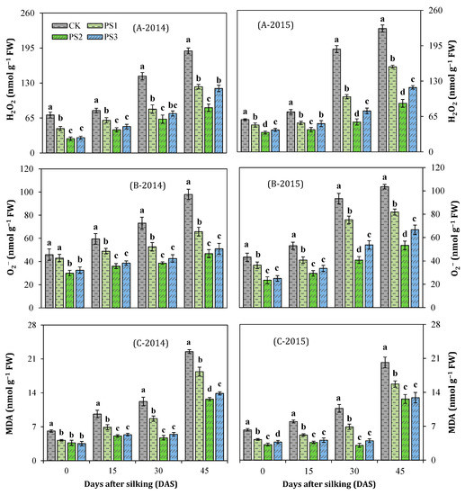 Effects of paclobutrazol treatments on (A) hydrogen peroxide, H2O2, (B) superoxide radical, O2−, and (C) malondialdehyde, MDA, contents in maize leaves during 2014 and 2015. Data are presented as mean ± SD of three measurements. Different small letters on the bars indicate significant differences at P < 0.05 (LSD test). The abbreviations of treatment names are the same as those described in Figure 2.