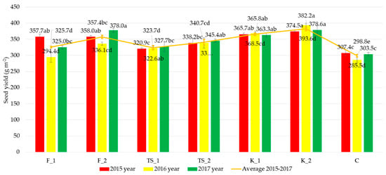 Effect of Fylloton, Terra Sorb Complex, and Kelpak biostimulant treatment on seed yield of bean variety Oczko. Abbreviations: F_1, single spraying of Fylloton; F_2, double spraying of Fylloton; TS_1, single spraying of Terra Sorb Complex; TS_2, double spraying of Terra Sorb Complex; K_1, single spraying of Kelpak; K_2, double spraying of Kelpak; C, control. Means over the study years followed by different small letters are significantly different at p < 0.05.