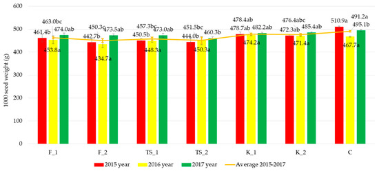Effect of Fylloton, Terra Sorb Complex, and Kelpak biostimulant treatment on the weight of one thousand seeds of bean variety Oczko. Abbreviations: F_1, single spraying of Fylloton; F_2, double spraying of Fylloton; TS_1, single spraying of Terra Sorb Complex; TS_2, double spraying of Terra Sorb Complex; K_1, single spraying of Kelpak; K_2, double spraying of Kelpak; C, control. Means over the study years followed by different small letters are significantly different at p < 0.05.