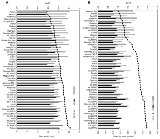 SA had a significant effect on both SL and SDM (P < 0.05; Table 2). The SATCs for SL and SDM (Figure 1) varied remarkably among the different cultivars. The SATC of SL ranged from 0.58 in the cultivar Aurora to 1.03 in the cultivar Relang. The SATC of SDM ranged from 0.42 in the cultivar Magnum Salt to 0.98 in the cultivar WL354HQ.