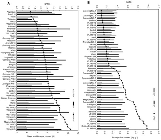 The shoot soluble sugar content (SS) (A) and shoot proline content (PRO) (B) of 50 alfalfa cultivars field-grown in nonsaline-alkaline (NSA) (open bar) soil and saline–alkaline (SA) (solid bar) soils during the seedling stage. The line represents the saline-alkaline-tolerance coefficient (SATC). Values are the means of absolute values, n = 3.