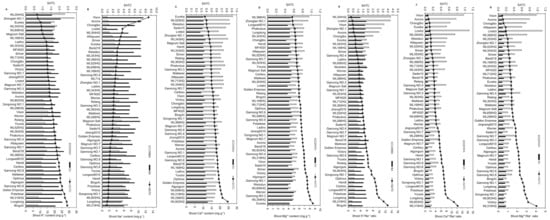 SA stress also significantly affected the contents of Na+, K+, Ca2+, Mg2+, and the ratios of Ca2+/Na+ and Mg2+/Na+ (P < 0.05, Table 2). The SATC of K+ ranged from 0.68 in cultivar WL354HQ to 2.46 in cultivar Bingchi (Figure 3A). For Na+ content, the cultivar Vison had the highest SATC value of 8.55. By contrast, WL319 had the lowest SATC value of Na+ under SA conditions, with a value of 0.86 (Figure 3B). For Ca2+ content, the cultivar WL903HQ had the highest SATC value of 0.82, whereas this was lowest in Eureka at 0.37 (Figure 3C). The SATC value of Mg2+ was lowest in cultivar WL366HQ at 0.56 and highest at 1.03 in Eureka (Figure 3D). The SATC of the K+/Na+ ratio ranged from 0.29 in WL354HQ to 3.97 in Bingchi (Figure 3E). For the Ca2+/Na+ ratio, the cultivar WL319HQ had the highest SATC value (0.81), whereas this was lowest in the cultivar Vison (Figure 3F). Finally, for the Mg2+/Na+ ratio, the SATC values were highest in cultivar WL319 at 0.97 and lowest in the cultivar Vison (Figure 3G).