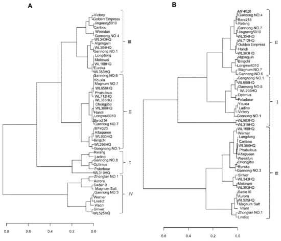 Clustering of the saline-alkaline (SA) tolerance in the 50 alfalfa cultivars based on the two methods. (A) Traditional method, (B) New method.