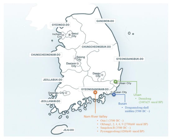 Map showing the archaeological sites of soybeans in Korea. Bullets under each city show the names of the archaeological sites while the dates in brackets show the carbon dating information on charred soybean seeds. If there is no carbon dating of the soybean samples, then the reported chronological year is given [81,83].