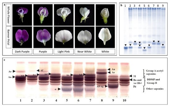 Demonstrations of the diversity in the CWLGC. (a) Flower color variations [40]. (b) Using Kunitz trypsin inhibitor, different KTi forms were detected in Korean G. soja accessions by non-denaturing PAGE. Lanes 1–9 are: Tia protein standard (Sigma), Tia, Tib, Tia/Tib, Tibi7-1, Tia, Tibi5, Tib, and Tia, respectively [110]. (c) Comparison of saponin composition phenotypes in seed hypocotyls in the Korean G. soja collection by thin-layer chromatography (TLC). Lanes 1–7 are the common phenotypes: Aa, Ab, AaBc, AbBc, Aa+a, AaBc+a, and AbBc+a types, respectively. Lanes 8, 9, and 10 are mutant phenotypes: AuAeBc (CWS0115), A0Bc+ag (CWS2133), and A0Bc-S (CWS5095) types, respectively [32].