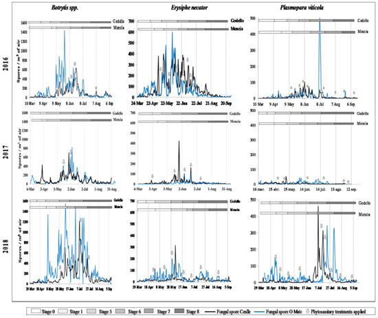 Considering the pathogen relation with the different grapevine phenological phases, we found a considerable variability depending on the pathogen, season, and vineyard location. The Botrytis and Erysiphe airborne spore presence were almost constantly along the grapevine growth cycle, while the Plasmopara sporangia did not show a continuous daily record. For the considered 2016–2018 period, we found 29 days/season average of Plasmopara 0-record in Cenlle, and 20 days/season in O Mato.