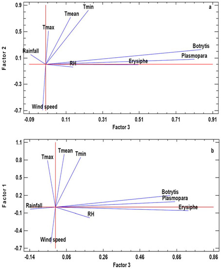 In both analyzed areas, the Principal Components PC1 and PC2 included meteorological variables and the PC3 grouped the three phytopathogenic fungi spore concentrations. For Cenlle, PC1 includes the maximum and mean temperatures, humidity, and rainfall and PC2 includes the minimum temperature and wind speed. In the case of O Mato, PC1 include the temperatures and the wind speed, whereas PC2 includes the water-related parameters. Most of the variables had significant positive loads, except wind speed (PC2 in Cenlle and PC1 in O Mato). For graphic representation, we selected PC2 versus PC3 for the Cenlle vineyard, and PC1 versus PC3 for the O Mato vineyard (Figure 3). In the obtained charts we showed in detail the relation between fungal airborne spores and the main meteorological variables. In both vineyards we observed a high positive association degree between meteorology and fungal spores counts.