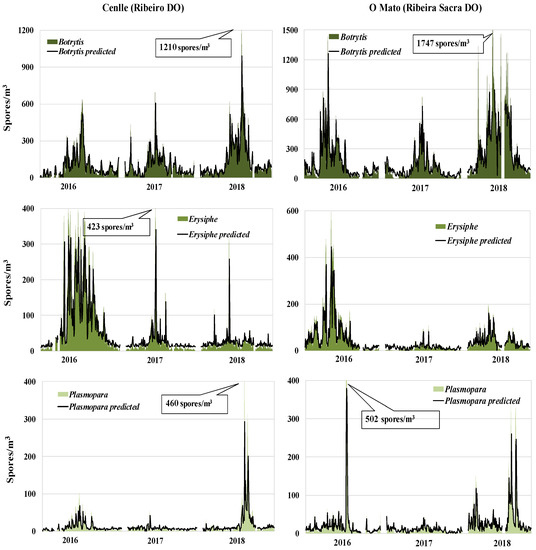In order to select the meteorological variables for model development we took into account the statistical results. The relative humidity of three days before and the spore concentration of the previous day for each fungal type were the highest significant parameters. For most cases, we obtained a good fit between real and forecast values (Figure 4). The greatest predictive difficulty was focused on the maximum spore peaks, such as Botrytis in 2018 at both vineyards, Erysiphe in 2017 at Cenlle vineyard, and Plasmopara in 2016 at O Mato vineyard, since the models failed to reach the exact real values.
