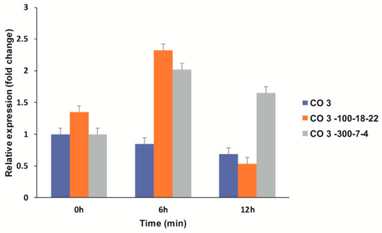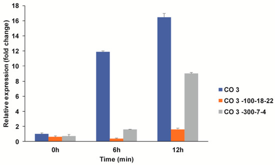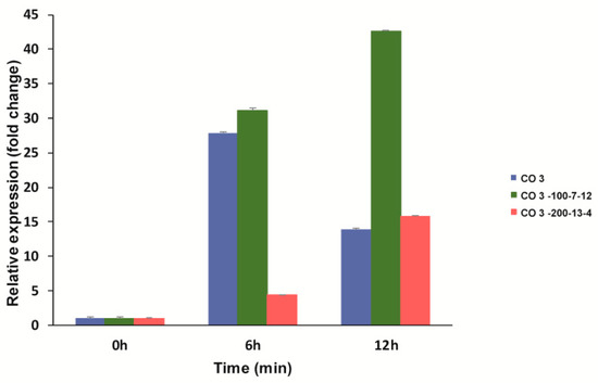 The expression of PPDK in Control CO 3, CO 3-100-7-12 and CO 3-200-13-4 at 0 hr. was unaltered; however, a significant upregulation was observed in CO 3 and CO 3-100-7-12 at 6 h post-dehydration treatment (more than 10-fold). At 12 h, the expression was down regulated in CO 3 and upregulated in CO 3-100-7-12 and CO 3-200-13-4. Approximately 30-fold higher expression of PPDK was observed at 12 h post-treatment in CO 3-100-7-12 (Figure 8) which suggests that the expression may confer higher enzyme activity to ensure the effective functioning of C4 photosynthesis. Similar observations were reported [27] where the expression of PPDK kept increasing in a bioenergy feedstock grass Miscanthus × giganteus during chilling stress. However, a decline in expression was observed in maize [30]. Over expression of maize PPDK in Arabidopsis showed a 4-fold upregulation in the expression, and the photosynthetic rates of transgenic plants had also increased [28].