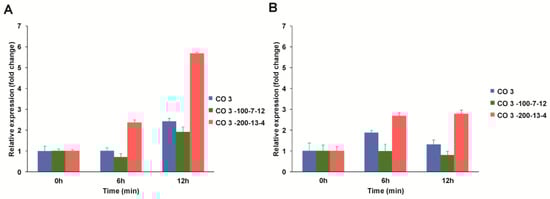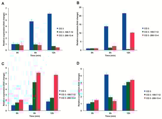 In case of NADP-MDH1, there was no much difference in the expression levels across the lines, but a 2- to 3-fold up regulation was observed in CO 3 at 6 and 12 h samples. The expression was unaltered in CO 3-100-7-12, whereas a significant down regulation was observed in CO 3-200-13-4 at the 12 h sample. NADP-MDH4 exhibited a similar expression profile in CO 3, where an interesting observation of ~4-fold up regulation was noted in 6 h and 12 h samples. At 6 h post-stress, the level of NADP-MDH4 was almost similar in CO 3-100-7-12 and CO 3-200-13-4, but at 12 h, CO 3-200-13-4 showed a 1-fold up regulation. By contrast, NADP-MDH10 was highly expressed in CO 3-100-7-12 and CO 3-200-13-4 during stress as compared to control, and in case of non-stress condition (0 h), elevated expression was observed in CO 3-200-13-4 followed by CO 3-100-7-12 as compared to CO 3. These results indicate regulation of this enzyme is sensitive to dehydration in mutated plants. The gene NADP-MDH11 showed an initial up regulation at 6 h post-stress in CO 3-100-7-12 but down regulated at 12 h. In contrast, the transcript levels were increased with time in CO 3 and CO 3-200-13-4 (Figure 10) Similar differential expression of MDH genes was reported in wheat [32], Arabidopsis [33], maize [34], apple [35] and cotton [36].