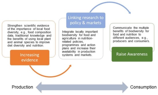 The three-pronged approach used by countries to establish enabling environments for mainstreaming biodiversity for food and nutrition into local food systems, from production to consumption (adapted from [,,]).