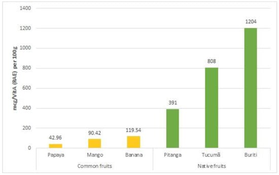 Vitamin A content (expressed in mcg RAE per 100g of fresh raw pulp/whole fruit, with or without peel) of the native Brazilian fruits pitanga (Eugenia uniflora), tucumã (Astrocaryum aculeatum) and buriti (Mauritia flexuosa) compared to more commonly available vitamin A-rich fruits. Source: Brazilian food composition tables [] and the System on Brazilian Biodiversity (SiBBr) database [].