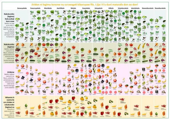 Seasonal calendar of fruits and vegetables in the Segou region, Mali, in the local language. Source: Bioversity International. [,].