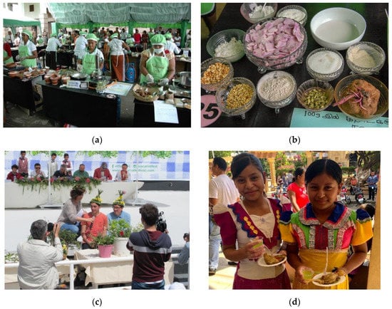 Special events such as fairs, festivals or national celebrations for World Food Day (Figure 5a–d) that attract wide media coverage can also raise the profile of orphan crops and wild herbs. Notable examples include the Traditional Food Festival in Sri Lanka or the Alaçatı Wild Herb Festival in Turkey, a four-day event devoted entirely to the celebration of wild edibles that promotes the appreciation of local biodiversity—including orphan crops—and attracts tourists, food gourmets, TV food channels and chefs for cooking workshops, food tastings and scientific lectures about the importance of these foods in healthy and sustainable diets.