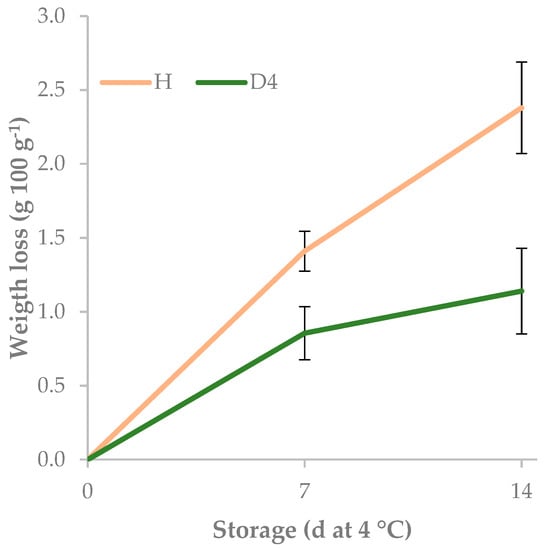 Weight losses may compromise marketability of leafy vegetables when they are higher than 4–6% []. Accession D4 and H remained well below this threshold during the 14 d of storage at 4 °C.