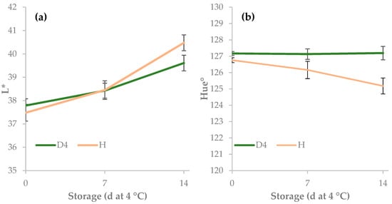 Influence of accession (D4 and H) and time of storage on color lightness (L*) (a) and hue angle (b) of minimally-processed borage leaves.