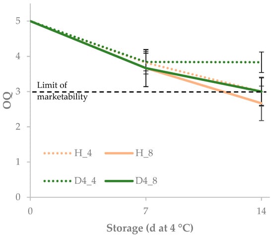 Even though the color variations were small, the perceived visual quality showed a reduction of the scores during storage. The score of the overall quality dropped significantly after 7 d of storage as function of accessions and plant densities; accession D4 planted at the lowest density (4 plants m−2) maintained its score up to the end of the trial, while the other samples were at the threshold of marketability (D4—8 plants m−2 and H—4 plants m−2) or below it (H—8 plants m−2) (Figure 7).