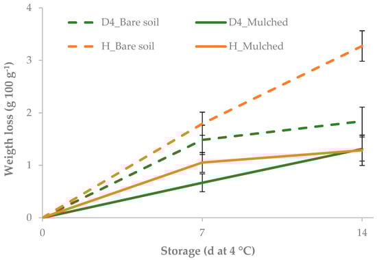 After processing, the leaves of mulched and non-mulched plants were stored for 14 days at 4 °C. The samples of non-mulched H borage recorded the highest weight losses and at the end of the trial reached 3.27 g 100 g−1 fw. Borage D4 grown on mulched soil had the lowest weight loss during the first week of storage and at the end of storage both D4 and H borage grown on mulched soil recorded the lowest weight loss (1.30 g 100 g−1 fw on average) (Table 6 and Figure 8).