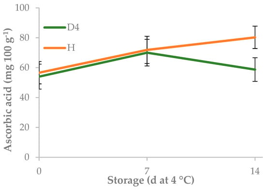 The antioxidant and nutritional value of vegetables is often related with their content of ascorbic acid, as over 90% of vitamin C in the human diet comes from fresh vegetables. Mulching negatively affected the ascorbic acid content of minimally-processed borage leaves, with a reduction of 47.6% and 71.4% for borage H and D4 respectively (Table 6). This result agrees with those of other authors that found a negative effect of black plastic mulching on the ascorbic acid content of lettuce, celery, pepper, and potato [,,,,]. The accessions of borage showed a significant interaction with storage time (Table 6 and Figure 10); borage D4 had no significant change of ascorbic acid content during storage while it significantly increased in borage H after 7 d of storage at 4 °C.