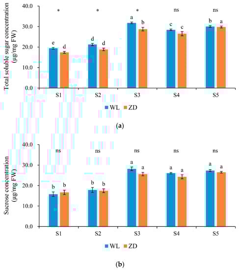 The change in SPS expression (Figure 5b) in the two cultivars followed a similar trend to that of sucrose concentration. SPS expression in ZD and WL exhibited no obvious change in response to abrupt chilling in phase 2, but a significant increase was observed in response to abrupt chilling in phase 5.