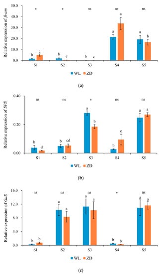 In the two cultivars, the relative expression level of β-amylase (β-am; Figure 5a) was low from S1 to S3. In ZD, significant changes were observed under abrupt chilling in phase 2 and during cold acclimation in phase 3. In both cultivars, β-am expression significantly increased as the temperature increased during deacclimation in phase 4. During abrupt chilling in phase 5, β-am expression decreased significantly in ZD.