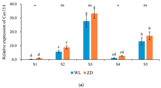 Relative expression levels of cold-regulated genes at five sampling points. Mean values (n = 4) ± standard errors of the mean are shown. Different letters (a, b, etc.) above bars indicate a significant difference among the five sampling points (from S1 to S5) in one cultivar (p < 0.05). The asterisk indicates a significant difference between the cultivars (S1 vs. S1, S2 vs. S2, etc.) at one same sampling point (p < 0.05), and the ‘ns’ indicates no significant difference. S1 to S5 are the sampling points after the five phases of the temperature-controlled treatment regime: in phase 1 the temperature was maintained at 18 °C, in phase 2 it decreased to 2 °C, in phase 3 it was maintained at 2 °C and −2 °C for two weeks, in phase 4 it increased to 18 °C, and in phase 5 it decreased to 2 °C. (a) Cas15A; (b) K3-dehydrin. WL = WL440HQ, ZD = ZhaoDong.