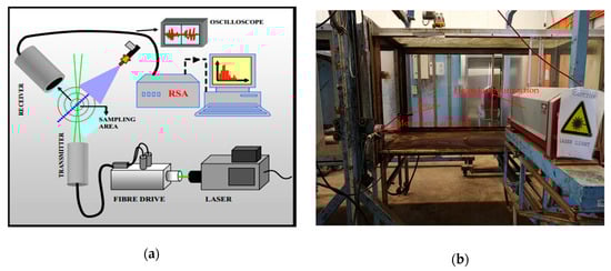 This study was carried out at the ground application wind tunnel research facility in the Centre for Pesticide Application and Safety (C-PAS) at the University of Queensland in Gatton, Queensland, Australia. The wind tunnel test system includes a traversing liquid delivery, an atomization system, a laser diffraction particle size analyser and a data storage and processing system. The droplet size spectra of each spray were measured by a Helos-Vario laser diffraction system with an R7 lens (Sympatec Inc., Clausthal, Germany). The laser was controlled by Windox 5.70 software operated on a computer. The test nozzles were oriented upright. All measurements were replicated at least three times until the Dv0.5 values were within instrument repeatability (i.e., ±3) [21]. Each replicate was measured for 9 s to provide sufficient time to measure the whole spray sheet. The schematic, setup geometry and configuration of wind tunnel test system are shown in Figure 1a,b.