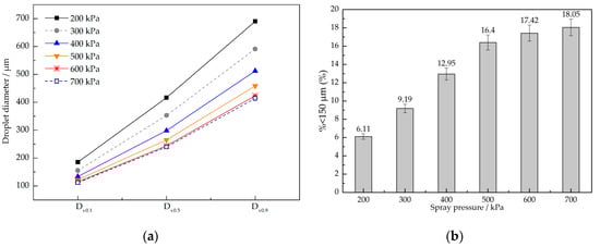 (a) Volumetric diameters below which smaller droplets constitute 10%, 50% and 90% of the total spray volume (Dv0.1, Dv0.5 and Dv0.9) and (b) proportion of the spray volume contained in droplets with a diameter below 150 µm (% < 150 µm) for 11001 under different spray pressures (200~700 kPa) at an air velocity of 3 m/s.