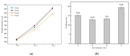 (a) Volume diameters below which smaller droplets constitute 10%, 50% and 90% of the total spray volume (Dv0.1, Dv0.5 and Dv0.9), and (b) proportion of spray volume contained in droplets with a diameter below 150 µm (% < 150 µm) for 11001 under different air velocities (2~5 m/s) at 400 kPa.