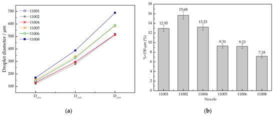 Generally, for a given spray pressure and air velocity, larger nozzle orifice diameter would result in larger droplet size. However, it was observed in this study that a larger nozzle orifice size did not always produce larger size droplets. As shown in Figure 4a, at a spray pressure of 400 kPa and air velocity of 3 m/s, the Dv0.1, Dv0.5 and Dv0.9 values for 11002 were 9 µm, 17 µm and 5 µm, respectively, which were lower than those values for 11001, and the values for 11006 were only 0.7, µm, 9.1 µm, and 7.78 µm, respectively, which were higher than those values for 11005. The same results can be obtained for % < 150 µm (Figure 4b). The % < 150 µm value for 11002 was 2.73% higher than that for 11001, and the % < 150 µm value for 11005 was slightly higher (0.08%) than that for 11006.
