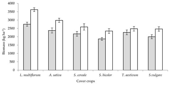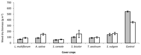 Weed suppression through cover crops is achieved by more than a single action. Importantly, both competition and allelopathy have been assumed as mechanisms of weed suppression by cover crops [,]. One important mechanism of action of a cover crop is its physical effect on weeds. Most of the studies on the effects of cover crops on weeds essentially consider the quantity of accumulated cover crop biomass []. A cover crop with high biomass production is likely to produce a good physical effect on weeds, and hence result in effective weed suppression. Early-season total biomass accumulation by cover crops reduces the risk of weed emergence (Figure 1 and Figure 2) [,]. The grass cover crops L. multiflorum, A. sativa, and S. cereale had a higher biomass than the other cover crops and suppressed the weeds effectively (Figure 3 and Figure 4).