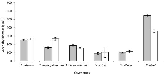 Effects of various legume cover crops in different vegetable production systems on the dry biomass production (g m−2) of weed species at the time of cover crop termination in 2005 (gray bars) and 2006 (white bars). Vertical lines represent standard errors of the means (p < 0.05) [,].