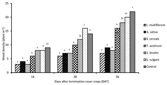 The density of weeds in sudangrass (Sorghum vulgare), S. bicolor, and T. aestivum were recorded as having the highest values after the value of control plots (Figure 5). On the other hand, the weed density of L. multiflorum, A. sativa, and S. cereale were recorded as having the lowest values, respectively.