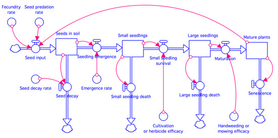 We constructed population dynamics models for giant ragweed in Stella Professional 1.6 (Isee Systems, Lebanon, NH, USA). The models included stocks for four life history stages of the weed (seeds in soil, small seedlings, large seedlings, and mature plants) and seven flows or processes (seedling emergence, small seedling survival, large seedling survival, seed production, mature plant senescence, post-dispersal seed predation, and seed decay) (Figure 2). Management factors represented in the models include the efficacy of herbicide applications or cultivation during row-crop (i.e., corn and soybean) and winter cereal (i.e., rye) phases of the rotations, and hand weeding or mowing efficacy for control of giant ragweed during any phase of the rotations. The models were constructed such that crop phases followed sequentially from year to year. This made it possible for weed fecundity and the efficacy of weed control via herbicides, cultivation, hand weeding, and mowing to be crop-specific.