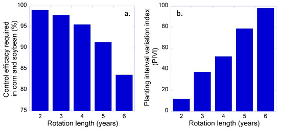 The relationship between planting interval variation index (PIVI) and the minimum level of control efficacy required in corn and soybean to prevent increases in giant ragweed seed density. As shown in Figure 3b, PIVI values differed among the 2-, 3-, 4-, 5-, and 6-year rotation systems.