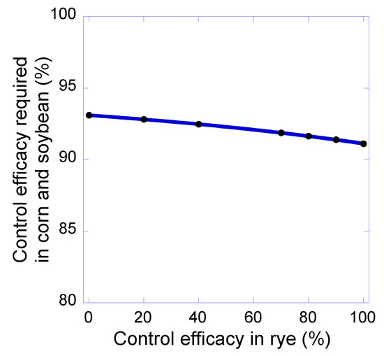Our first-order analyses assumed a high level of giant ragweed control efficacy in rye (90%), based on results obtained by Mahoney et al. [42] with herbicides applied to winter wheat. Because levels of weed control using cultivation equipment can be considerably lower than with herbicides [6], we conducted a sensitivity analysis to determine the effects of varying levels of giant ragweed control in rye. More specifically, we altered control efficacy in rye in the 5-year rotation from 0 to 100% and then determined the level of control that would be required in corn and soybean phases of the rotation to prevent increases in giant ragweed seed density.