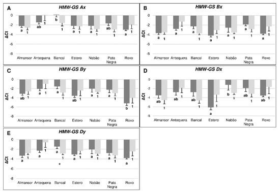 Transcription levels of High Molecular Weight Glutenin Subunits (HMW-GS) encoding genes: HMW-GS Ax (A), HMW-GS Bx (B), HMW-GS By (C), HMW-GS Dx (D), HMW-GS Dy (E). Dark bars represent control conditions and light bars represent high temperature treatment. Negative ΔCt values result from their marked higher expression in relation to reference genes. Means ± SE from five biological replicates. Different letters (control) and numbers (treatment) indicate significant differences between varieties and (*) show statistical differences between control and treatment values (p < 0,05).