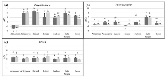 Transcription levels of Puroindolines a (a) and b (b) and GBSSI (c) encoding genes. Dark bars represent control conditions and light bars represent high temperature treatment. Negative ΔCt values result from their marked higher expression in relation to the reference genes. Means ± SE from five biological replicates. Different letters (control) and numbers (treatment) indicate significant differences between varieties and (*) shows statistical differences between control and treatment values (p < 0,05).