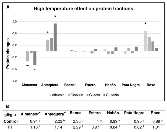 It has been previously reported that different environmental conditions during grain filling induce alterations in the time course of grain development, modulating final grain weight, protein and starch contents, as well as gluten protein composition. However, these former studies were based on the evaluation of only one bread wheat variety [9,10,11,12,13,14]. Our results, obtained in different varieties, disclosed heat response variability in terms of seed storage proteins composition. In fact, comparisons of control and HT treated plants (Figure 3A) revealed significant alterations in Almansor and Antequera, which presented significant differences in globulins and glutenins contents, although with opposite effects, both increasing in Antequera and decreasing in Almansor. In turn, Roxo grains from HT treated plants have significantly higher albumin levels.