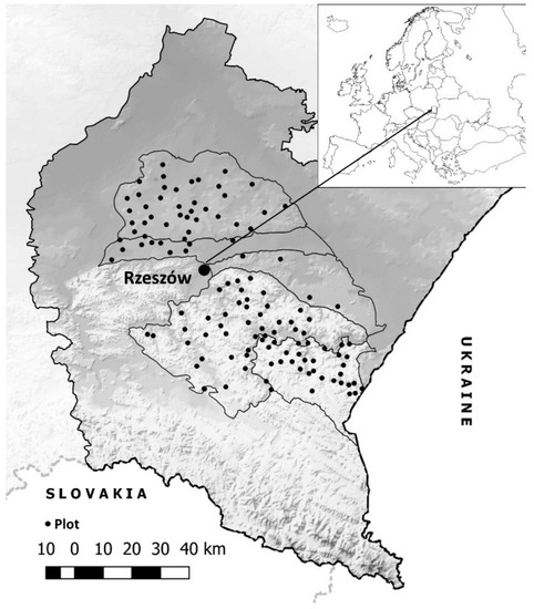 The research was carried out from May to July 2010–2017 in various types of seminatural meadows of the highlands, in different conditions of habitat moisture, soil pH and richness in selected macro- and micro minerals. The research area (Figure 1) included physiographically diverse fragments of the Central Beskid Foothills and the Carpathian Foothills (SE Poland: 49.5626–50.4048° N, 21.4815–22.8713° E). The southern part is distinguished by the presence of uniform hills running from northwest to southeast, and their absolute heights range from 250 to 350 m above sea level. Brown, loam and luvisols are the most common soils there, alluvial soil occurs in river valleys and low peats in low basins. The length of the growing season varies from 210 to 225 days and the average annual rainfall from 700 to 800 mm. There are uplifted plains in the central and northern parts of the study area lying at an altitude of 220–250 m a.s.l. Luvisols and brown soils occur in this area, alluvial soils in river valleys, and swamps in drainage areas. The average annual rainfall is 600–700 mm and the growing season lasts 220–225 days.